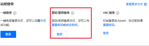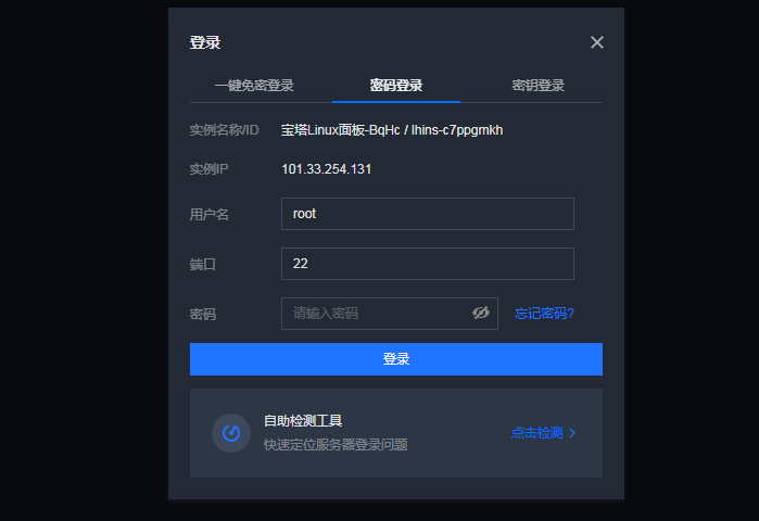 1.打开制控台,找到对应的服务器,选择密码/密钥登录