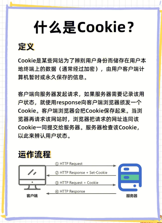 Cookie,有时也用其复数形式 Cookies。类型为“小型文本文件”,是某些网站为了辨别用户身份,Cookies发音“哭kiss”,也类似“哭ki丝”的发音,作用:我们浏览网站网页的时候,经常会登录各种各种的网站。特别是网上商城、论坛、自媒体平台等,登录网站经常遇到浏览器提醒记住密码或一周内免登录,勾选之后就发现下次再访问这些网站就不用再次输入密码登录了,可以直接以用户登录的状态进行浏览网站