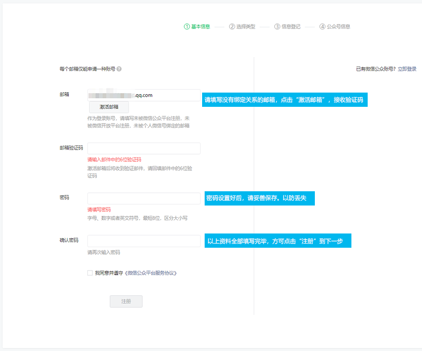 填写邮箱,登录您的邮箱,查看激活邮件,填写邮箱验证码激活