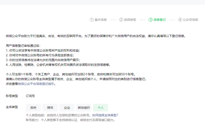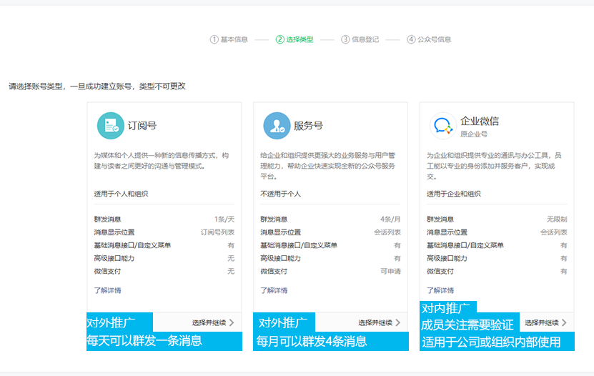 了解订阅号、服务号和企业微信的区别,选择账号类型(个人仅支持注册订阅号)