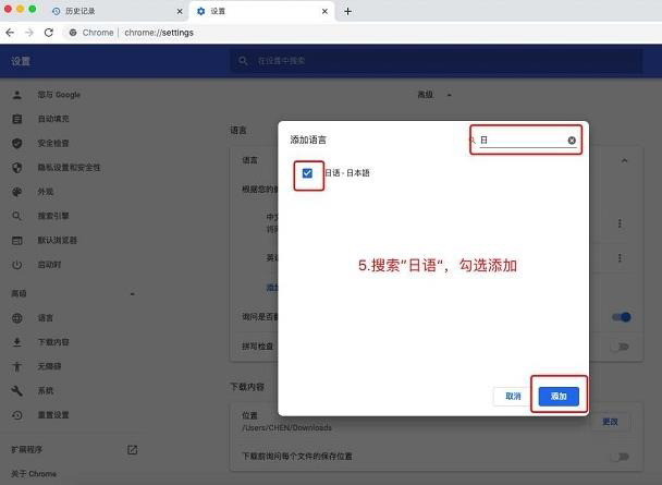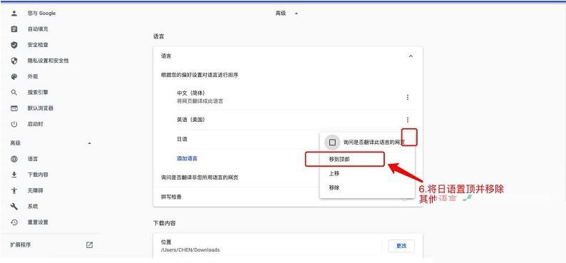 语言更改操作流程:点击谷歌浏览器右上角的三个点菜单按钮,选择“设置”——“高级”——“语言”——添加“日语”并置顶同时删除其他语言。