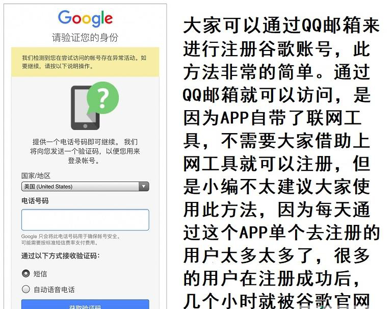 大家可以通过QQ邮箱来进行注册谷歌账号,此方法非常的简单。通过QQ邮箱就可以访问,是因为APP自带了联网工具,不需要大家借助上网工具就可以注册,但是小编不太建议大家使用此方法,因为每天通过这个APP单个去注册的用户太多太多了,很多的用户在注册成功后,几个小时就被谷歌官网封号了。