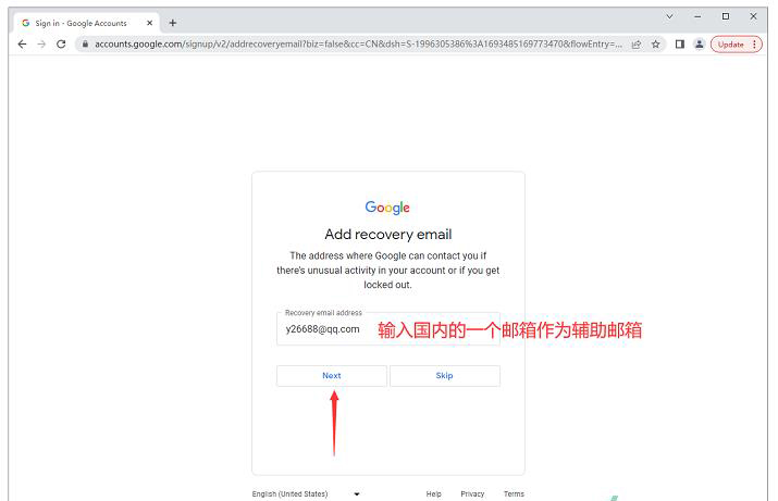 第六步:输入您准备好的国内邮箱,辅助邮箱是非常重要的,要是密码忘记了,我们都是可以通过辅助邮箱找回的,输入后点击“Next”按钮进入下一步。