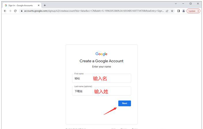 第二步:输入名和姓,然后点击“Next”进入下一步。