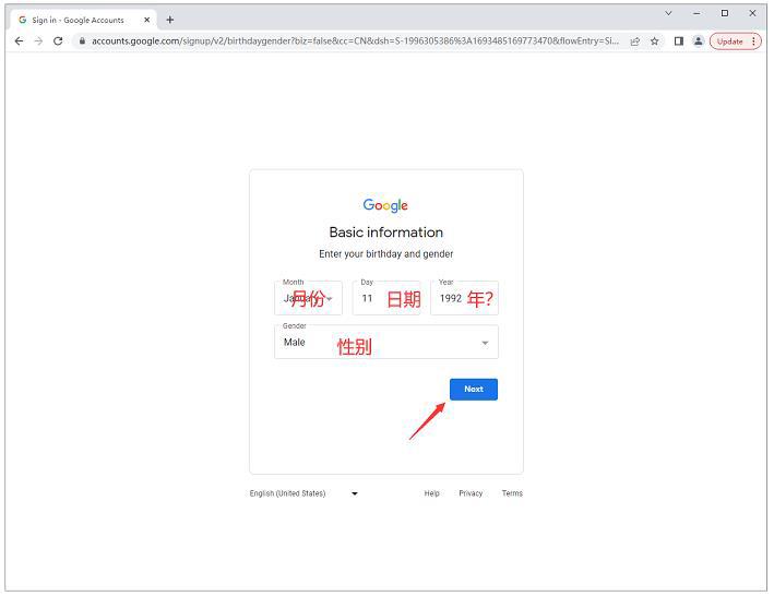 第三步:选择出生年月日和性别,点击“Next”按钮。