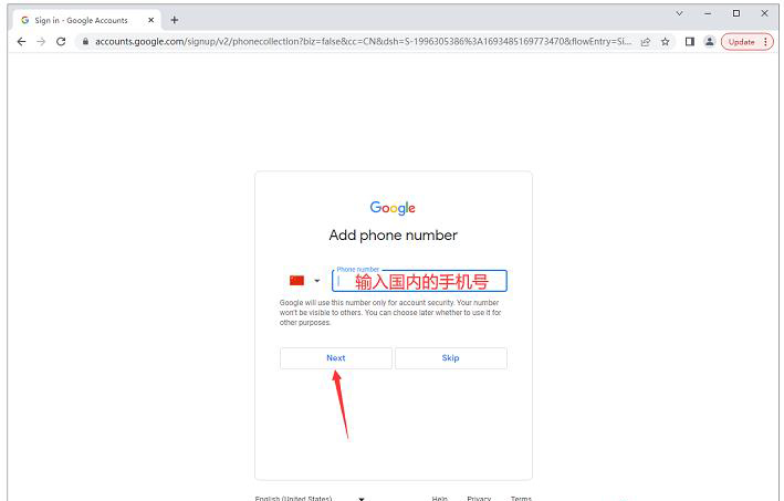 第七步:接着是输入国内手机号码,前面一定记得加+86区号,然后点击“Next”按钮进行验证,我们的手机收到验证码后填入即可。