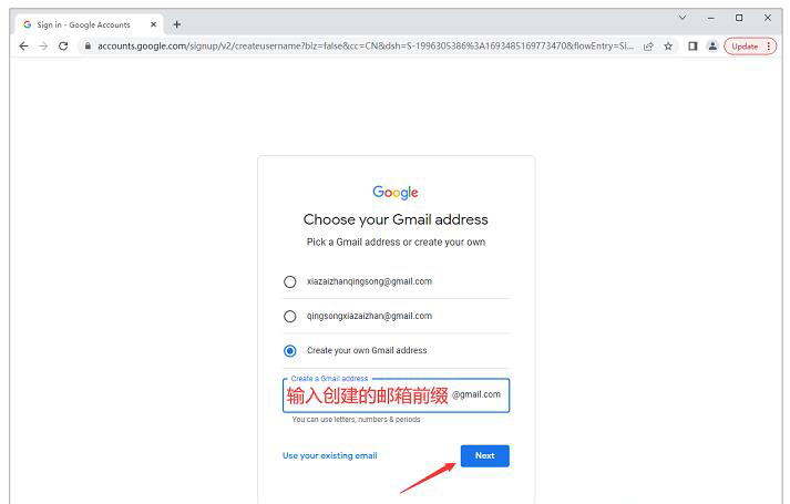 第四步:输入想要创建谷歌邮箱的前缀,然后点击“Next”按钮。
