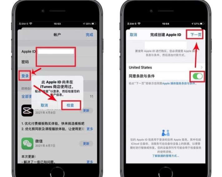 8、接下来我们需要到App Store,登录刚才注册的美国苹果ID,会提示Apple ID需要检查账户信息,点击【检查】,在接下来的页面打开同意条款于条件开关,点击【下一页】继续;