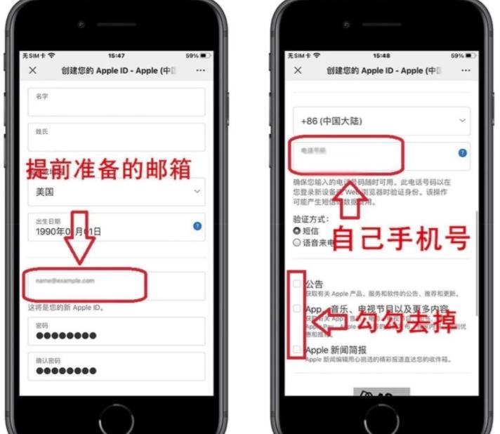 2、接下来继续完善剩下的内容,再输入电子邮件和手机号,拉到底部把【公告】、【更多内容】、【Apple 新闻】这三处的勾都去掉;