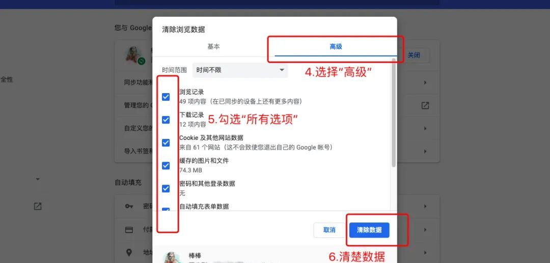 2、选择高级保证浏览器的所以缓存全部清除干净,清理后重新启动浏览器;