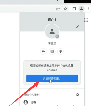 1、点击浏览器右上角头像——【开启同步功能】;