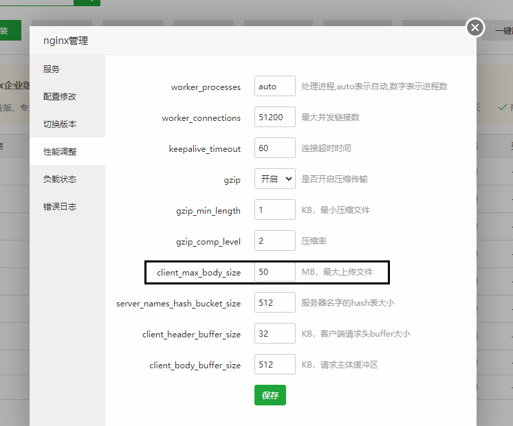 2.2:PHP修改完成后再修改Nginx,同样在软件商店-Nginx-性能调整-找到client_max_body_size将50更改为和PHP设置时一样的数值。