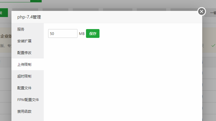 2.1:如果使用宝塔面板则在软件商店-对应的PHP版本-设置-上传限制将50更改为您所需的大小。