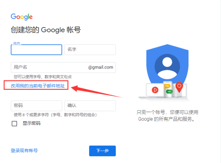 2,在创建页面选择“改用我的当前电子邮件地址”,使用已有的电子邮件地址来创建。