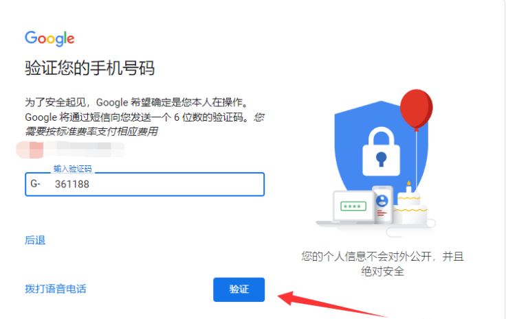 6,Google 还会要求要验证手机号码,按照提示输入一个国内手机号码接收验证码进行验证即可(如果出现提示此电话号码无法用于验证的情况,可先将 Chrome 浏览器系统语言设置为英语,然后重启Chrome,再次注册即可解决)