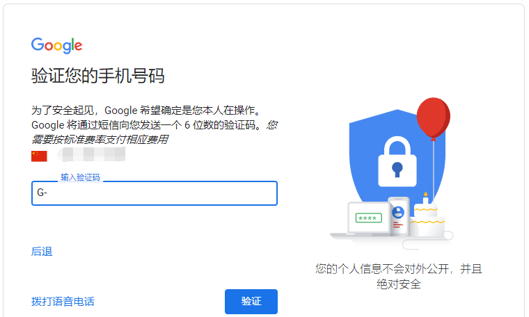 在验证您的手机号码这一步,很多人都卡在这一步,没有注册成功。如果你的手机收到了Google发送的验证码,直接在输入验证码即可完成注册。