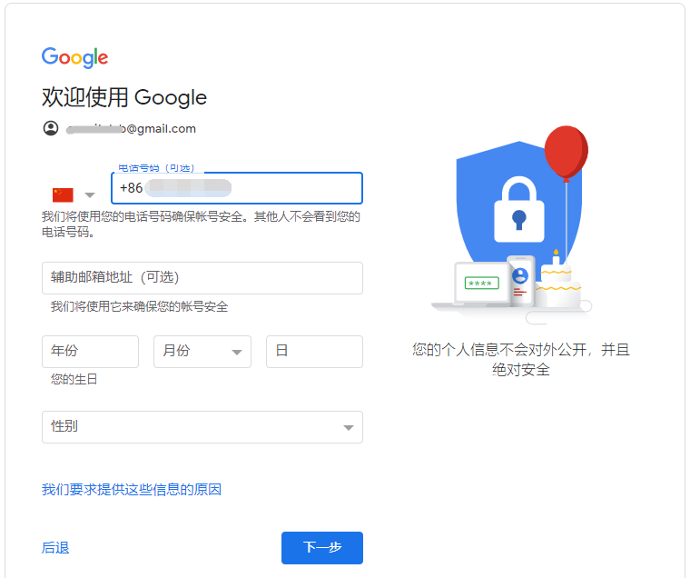 第五步:验证手机号后,填写辅助邮箱和生日日期和性别,下一步