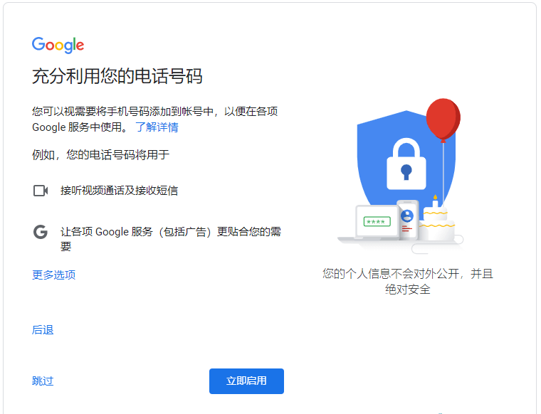 第六步:在充分利用您的电话号码页面,选择“立即启用”或者“跳过”按钮