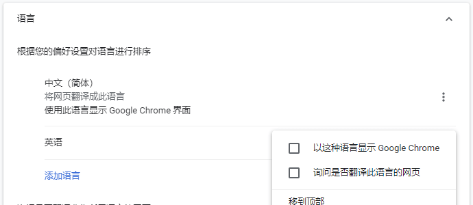 第二步:在左侧的“高级”菜单中选择“语言”,添加英语(或者繁体中文)并选择“以这种语言显示Google Chrome”,然后选择“移除”中文(简体),然后重新打开浏览器。