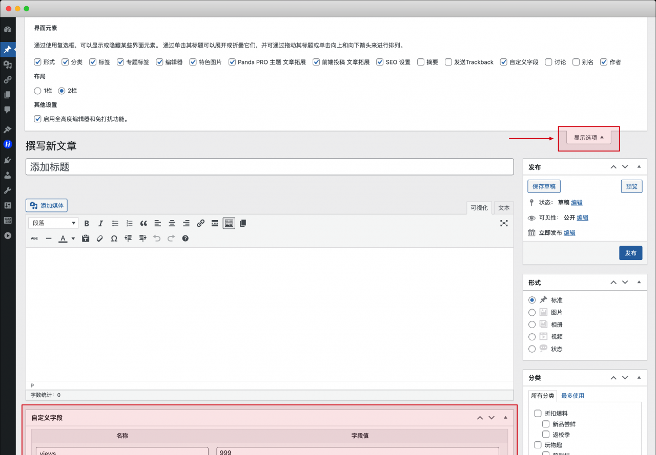 默认情况下,自定义字段选项被隐藏在帖子编辑屏幕上。