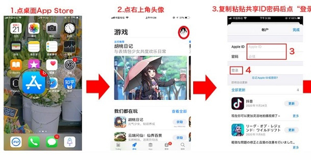 首先,打开手机App store苹果应用商店,点击右上方的头像,退出当前所登录的账号;然后,复制粘贴共享苹果id账号,点击登录按钮;最后,选择其他选项和不升级,跳过双重认证;