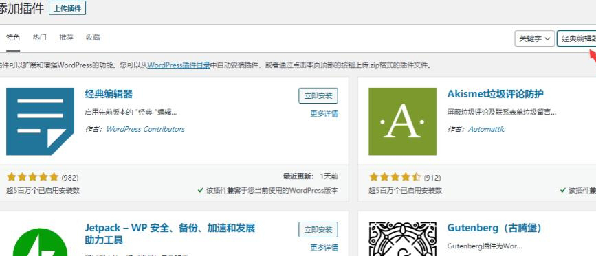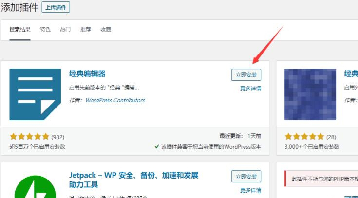 3,在弹出的搜索结果页中,你就可以看得到第一个插件就是经典编辑器,点击立即安装,然后页面上就会显示正在安装。