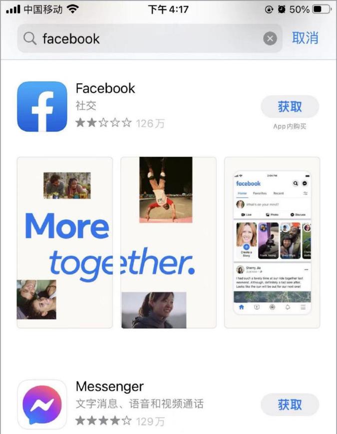 5、现在我们在App Store搜索框输入“Facebook”就出来啦!我们点击获取即可。