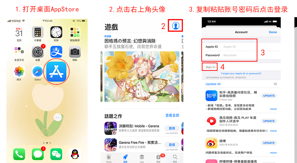 2、再到AppStore里面登录我们准备好的美国苹果ID账号,一定要按下图流程操作。