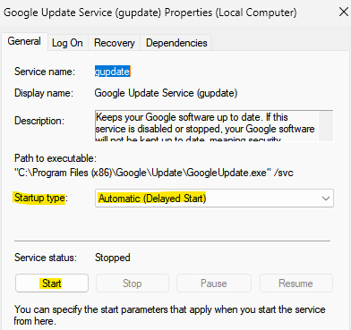 7、在常规选项卡下,转到【启动类型】并设置为【自动】或【自动(延迟启动)】;