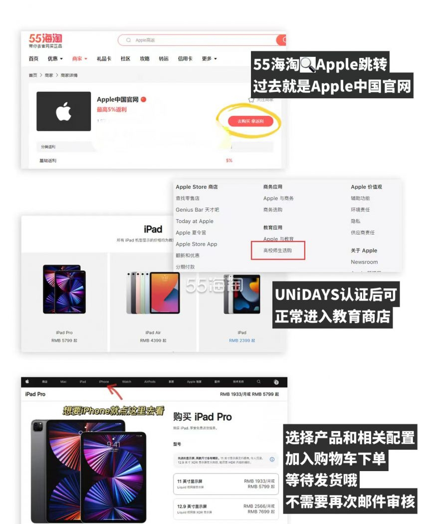 1、首先,需要注册55海淘会员(必填邀请码55xhs),通过55海淘进入苹果中国官网后,拉到最底部——教育应用——高校师生选购,再点击“通过UNiDAYS进行验证 脚注**“进入教育优惠页面,请大家一定要认证UNiDAYS,不然是不能进入苹果教育商店选购产品的;