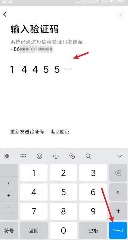 6、此时输入您所收到的验证码,然后点击下一步;