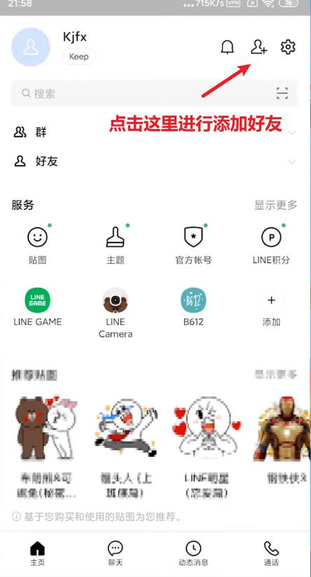11、到这里您的Line账号就注册成功了,点击右上角加号按钮就可以添加好友了;