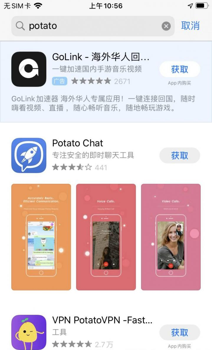 6、接下来,在App Store搜索框输入”potato“,这就是官方potato APP了,点击获取即可;