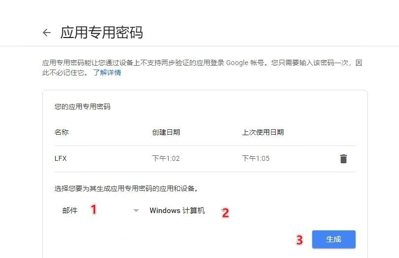 这里选择“邮件/Windows计算机,再点击【生成】,请确保已经开启两步验证。