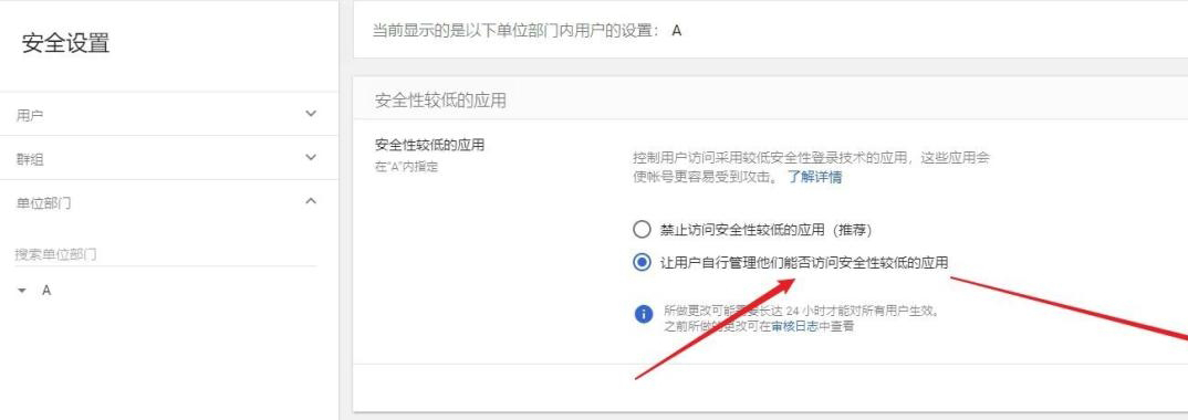 这里选择【让用户自行管理他们能否访问安全性较低的应用】,保存即可。
