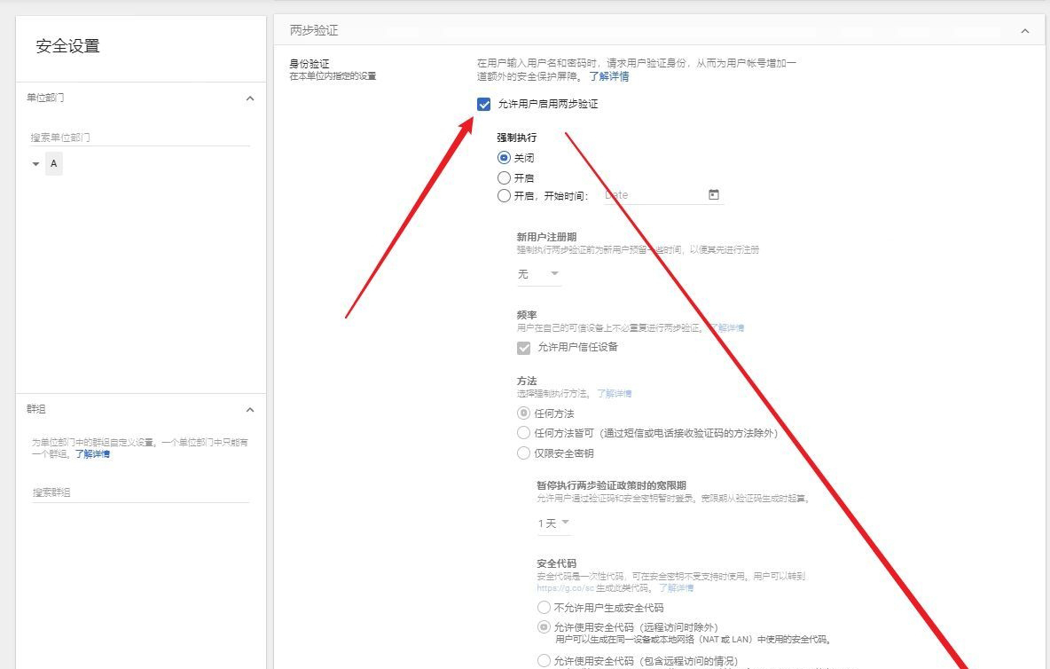 这里勾选【允许用户启用两步验证】,保存即可。