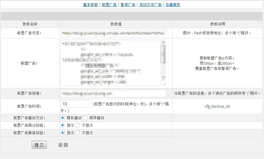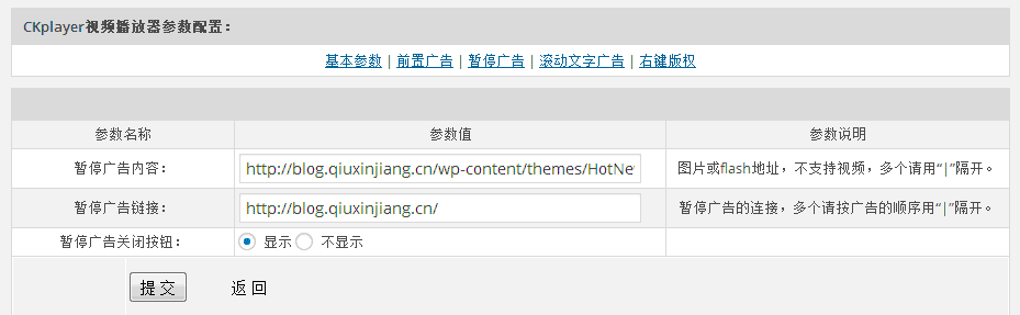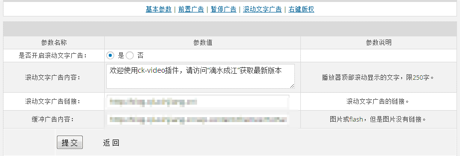 1、启用插件后可设置基本参数、前置广告、暂停广告、滚动文字广告、右键版权等设置,请参照ckplayer官方要求及插件要求设置。下图几个图为设置界面。