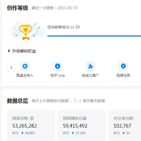 可能从2021年起,我的知乎账号:玉成,也要改变分享风格了,多少要垂直一些领域了,为什么呢?因为可以更好的恰饭呐,额,应该说更好的运营这个知乎账号以便于早日可以商业挣点小钱钱,先说下我的账号情况:目前拥有10万多粉丝,文章阅读量超过5000万次,视频播放量过6000万次,创作等级早已经满10级,通过知乎品牌任务发一篇软文大概2600元左右,如果你也在做知乎,那么可以看看我这里的一点简单的经验分享,也许可以帮你快速的积累实现赚钱之梦。