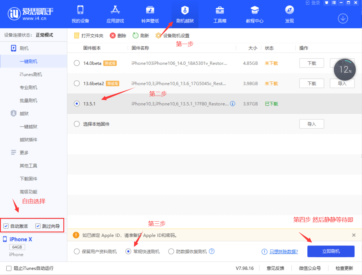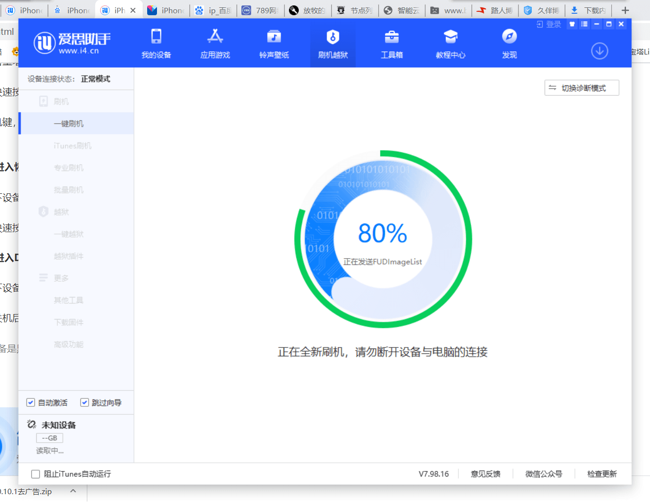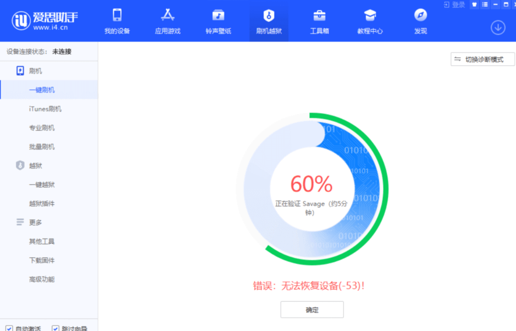 联系了一下爱思的客服 他跟我说是网络问题,然后客服他们发给我一个加速器,挂上之后顺利刷机成功。
