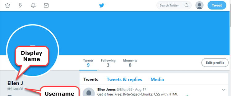 用过推特的用户都知道推特账号的名字包含有两个名字:一个是显示名,一个是用户名;从这个图片我们就可以很清楚的看到。其实这两个名字都是可以进行更改的,我们就来看一下怎么分别更改这两个名字吧。