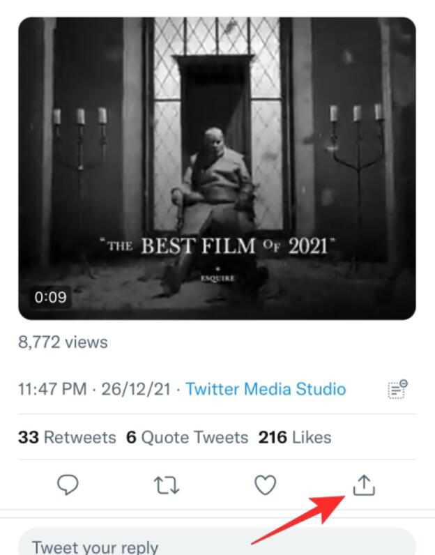 启动 Twitter 应用程序并打开要下载的视频。当带有视频的推文打开时,点击推文下方的共享图标。