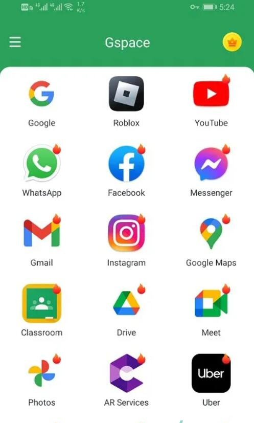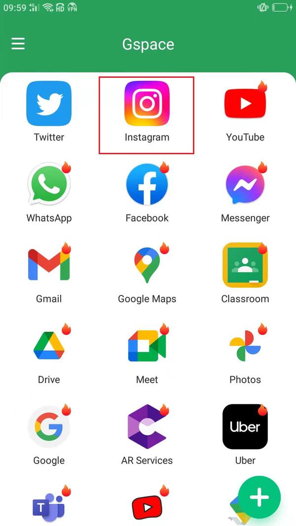 6,INS安装好过后,我们下次怎么进入ins呢?我们打开Gspace,进入主界面,我们可以在主界面看到我们所有安装的APP。图标右上角没有“火”图标的,都是我们已经安装了的软件,有“火”图标的,就还没有安装。在这里,我们就可以看到我们安装的ins,可以直接点击图标进入,和手机桌面上的快捷方式是一个道理。