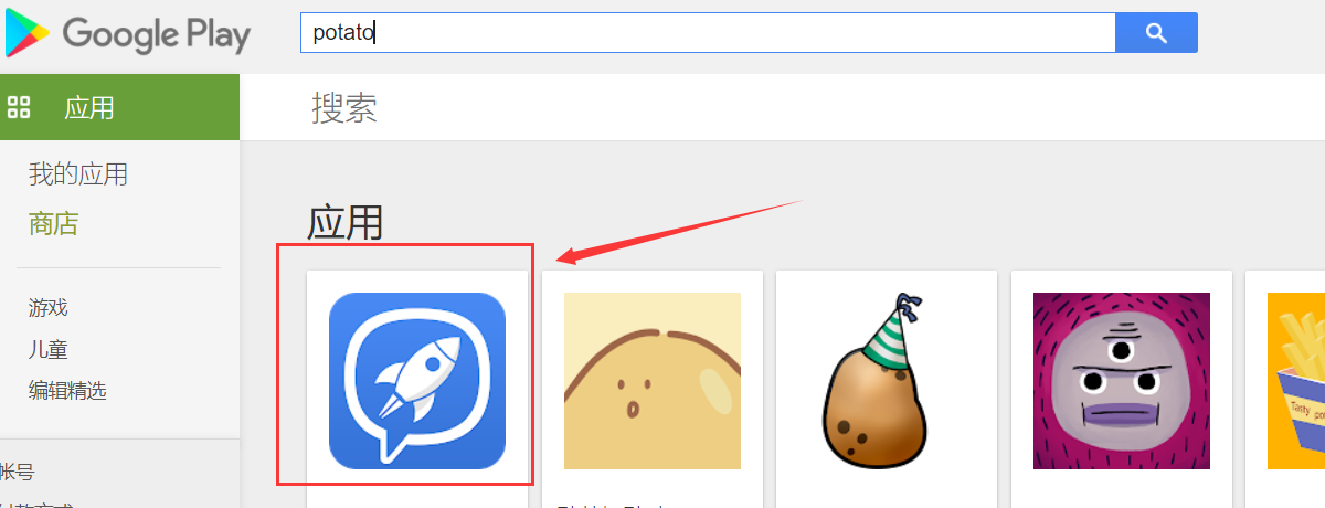 4、这个时候,我们就可以去搜索框里面搜索“potato”了,大家会发现,正版 potato 出来了,点击下载即可成功安装。