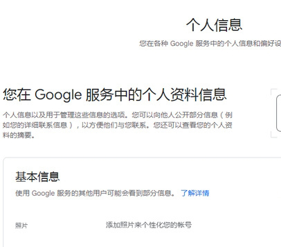 2、然后,我们就到了我们谷歌账号主页页面了,这里点击页面右上角的“个人信息”。