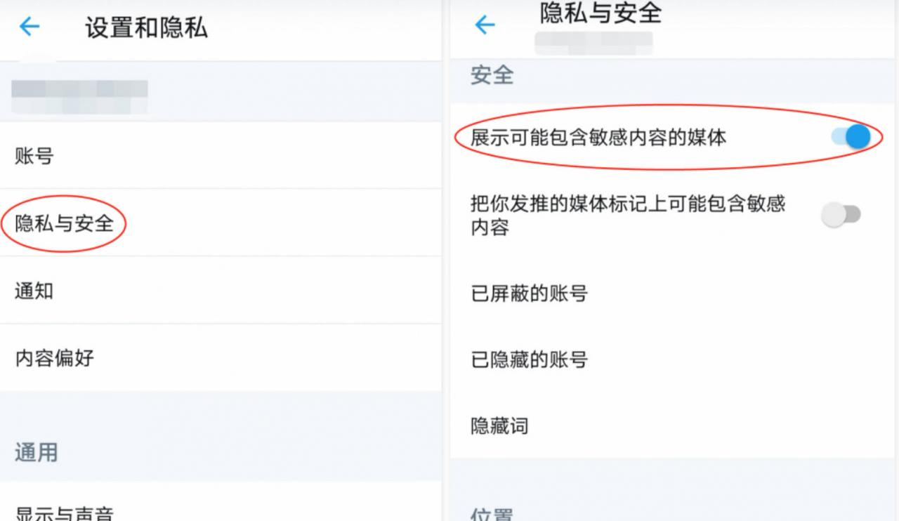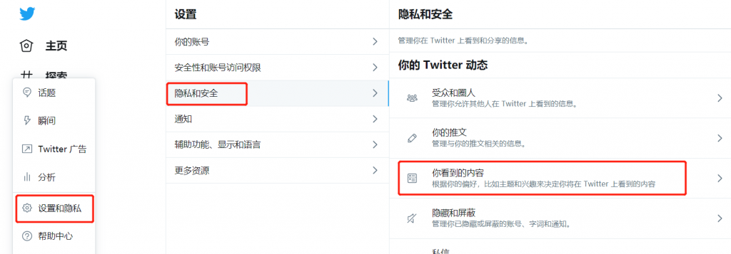 1、选择【推文】-【设置和隐私】-【隐私和安全】-【你看到的内容】