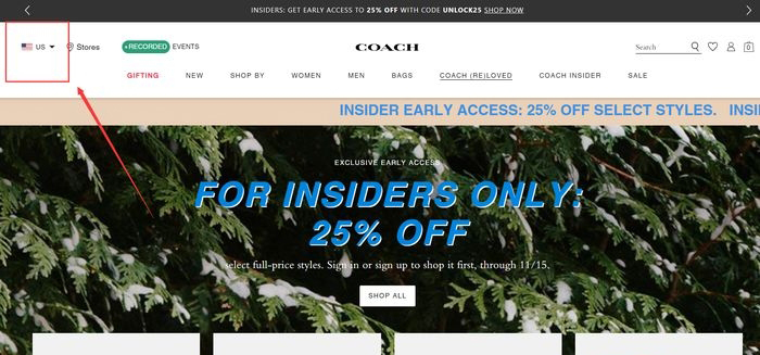 当你用美国IP访问coach官网,就会进入美区,我们可以首页的左上角看得到,国家地区定位的是美国,这就成功了。