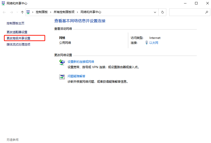 4、右键点击任务栏右下角的网络图标,在打开的项中,选择打开网络和Internet设置,打开的新窗口中,依次点击:更改适配器选项 - 网络和Internet - 网络和共享中心,点击左侧的更改高级共享设置;