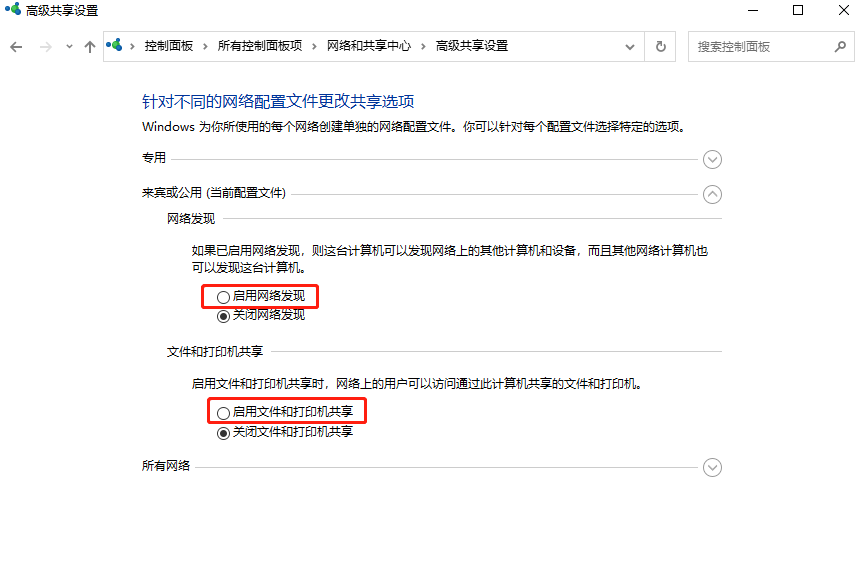 5、路径:控制面板 - 所有控制面板项 - 网络和共享中心 - 高级共享设置,点击网络发现下的启用网络发现和文件和打印机共享下的启用文件和打印机共享,最后点击保存更改即可;