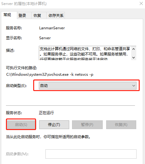 6、按 Win + R 组合键,打开运行,并输入:services.msc 命令,确定或回车,可以快速打开服务,然后在服务窗口中,找到并双击打开Server选项,将启动类型设置为自动并启动该服务,最后点击确定;